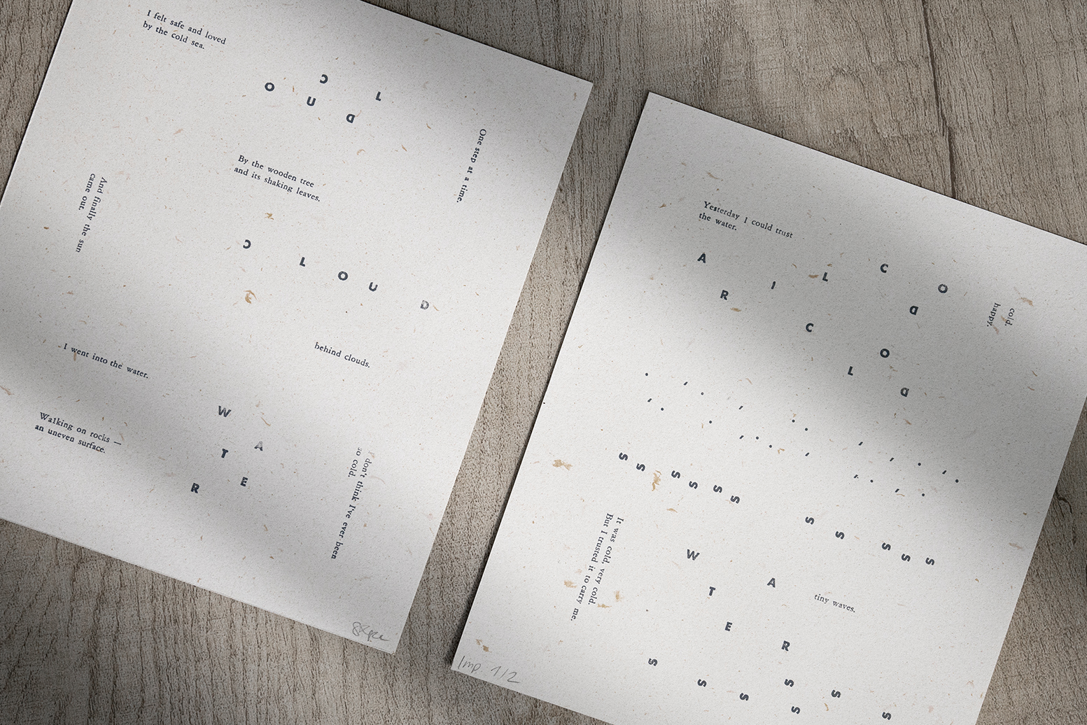 It was cold in Finland and just before the start of winter when I went into the lake in Espoo. Inspired by the experience of feeling part of the landscape, I wrote a few lines. The letterpress works were set by hand from lead letters in 6pt Garamond, among others. The workshop at Aalto University provided enough time and space for the highly detailed process.